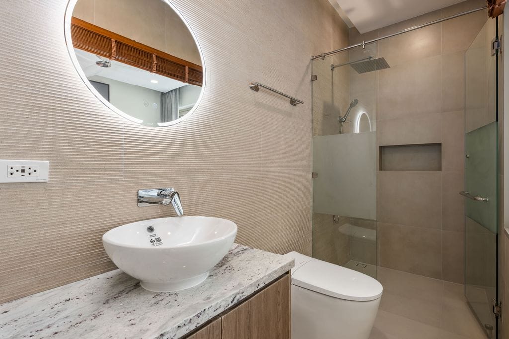 The villa features three well-appointed bedrooms, each with en-suite bathrooms fitted with modern fixtures including Japanese-style toilets, as well as access to a connecting walkable balcony. A total of 3.5 bathrooms ensures convenience for both residents and guests, while the thoughtful layout enhances everyday living and rental appeal.