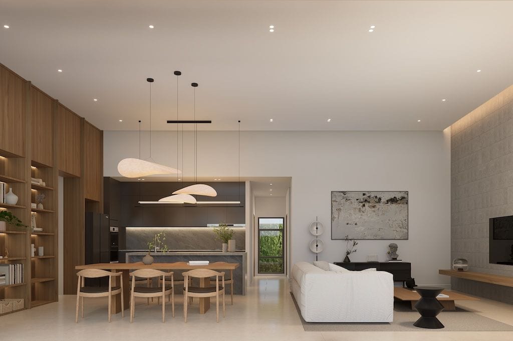 The design emphasizes open-plan living, with seamless flow between the living, dining, and outdoor areas, creating a bright and comfortable environment for everyday living.