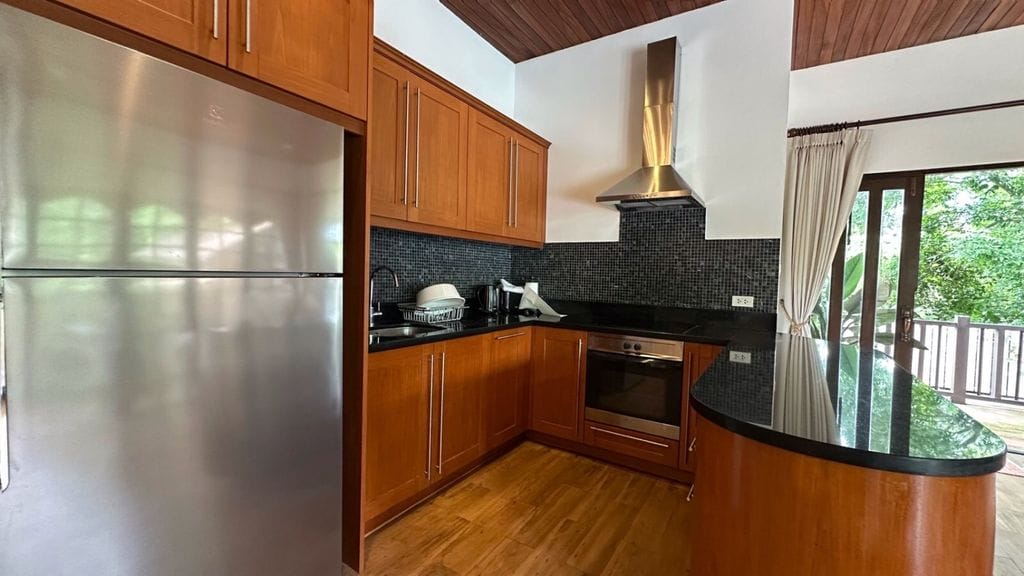 Buyers searching for villas for sale in Bophut will appreciate the spacious layout, private outdoor areas, and versatile multi-purpose spaces this property provides. The villa features a large open-plan living room that seamlessly connects to a fully equipped kitchen, creating a practical and social environment suitable for daily living and entertaining guests. Abundant natural light, garden views, and the surrounding greenery contribute to a relaxed, residential atmosphere that is increasingly rare in central Bophut.